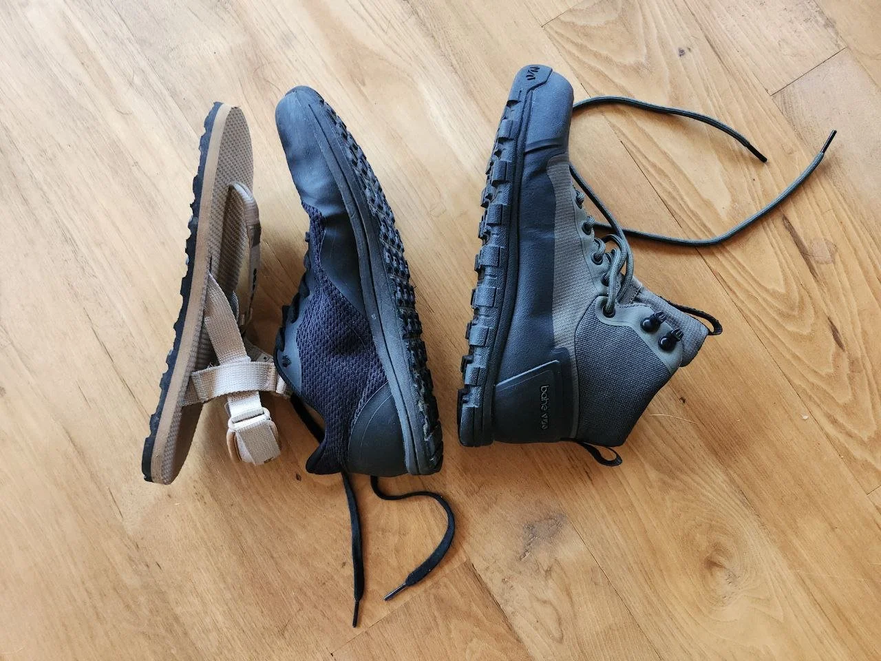 We prefer tried-and-tested Earth Runner sandals with Performance Laces, which are the best options for water wear and trail walking / hiking.